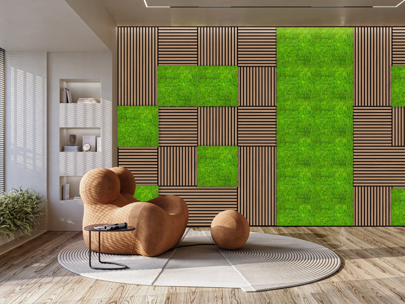 La serie "JANGAL Modular Wall" consente una progettazione degli spazi personalizzata e creativa. Questi pannelli acustici uniscono estetica e funzionalità e favoriscono uno stile di vita ecologico grazie a uno strato di supporto in PET riciclato proveniente da bottiglie usate. La scelta spazia dal muschio naturale alle pareti vegetali artificiali in fibre naturali sostenibili, fino a pareti vegetali dall'aspetto realistico, che possono essere combinate a piacere. L'innovativo sistema di connettori consente una progettazione delle pareti elegante e senza soluzione di continuità. La pluripremiata serie "JANGAL Modular Wall" pone l'accento su sostenibilità, qualità e design.