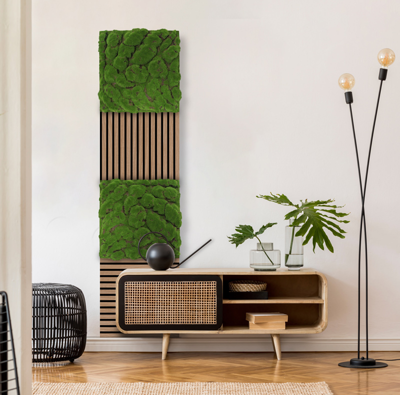 La serie "JANGAL Modular Wall" consente una progettazione degli spazi personalizzata e creativa. Questi pannelli acustici uniscono estetica e funzionalità e favoriscono uno stile di vita ecologico grazie a uno strato di supporto in PET riciclato proveniente da bottiglie usate. La scelta spazia dal muschio naturale alle pareti vegetali artificiali in fibre naturali sostenibili, fino a pareti vegetali dall'aspetto realistico, che possono essere combinate a piacere. L'innovativo sistema di connettori consente una progettazione delle pareti elegante e senza soluzione di continuità. La pluripremiata serie "JANGAL Modular Wall" pone l'accento su sostenibilità, qualità e design.