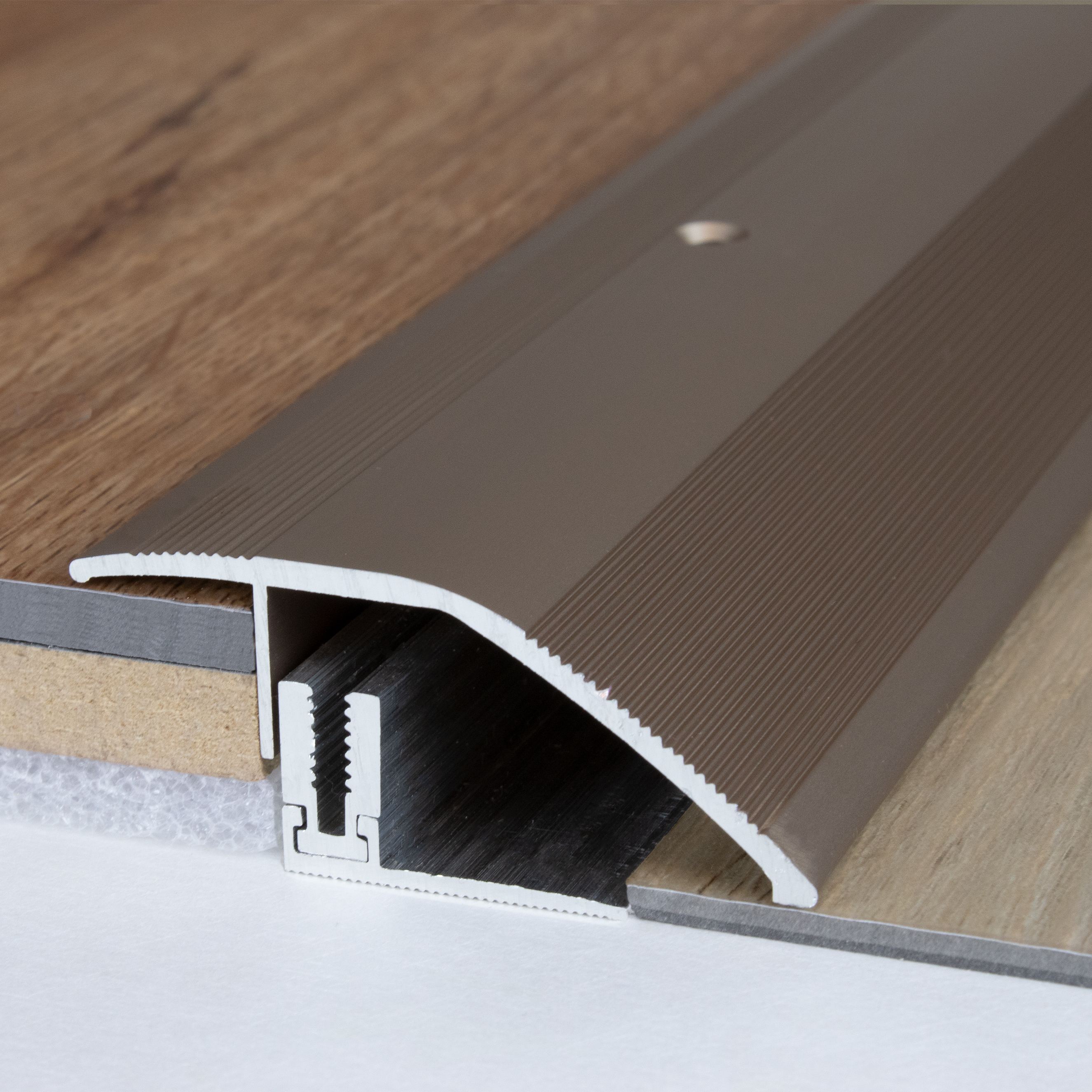 - COLORE: Bronzo chiaro. Grazie al suo aspetto semplice e moderno, questo colore si integra armoniosamente in qualsiasi stile di arredamento, indipendentemente dal fatto che i pavimenti siano scuri o chiari. DESIGN DEL PROFILO ACCATTIVANTE: Semplice, versatile e moderno. Questo profilo per pavimenti è senza tempo e un vero e proprio elemento di attrazione in ogni ambiente. APPLICAZIONI: Che si tratti di transizione dal parquet alle piastrelle, dal laminato alla moquette o dal vinile al legno, i nostri profili livellanti garantiscono una transizione fluida tra pavimenti di diverse altezze.