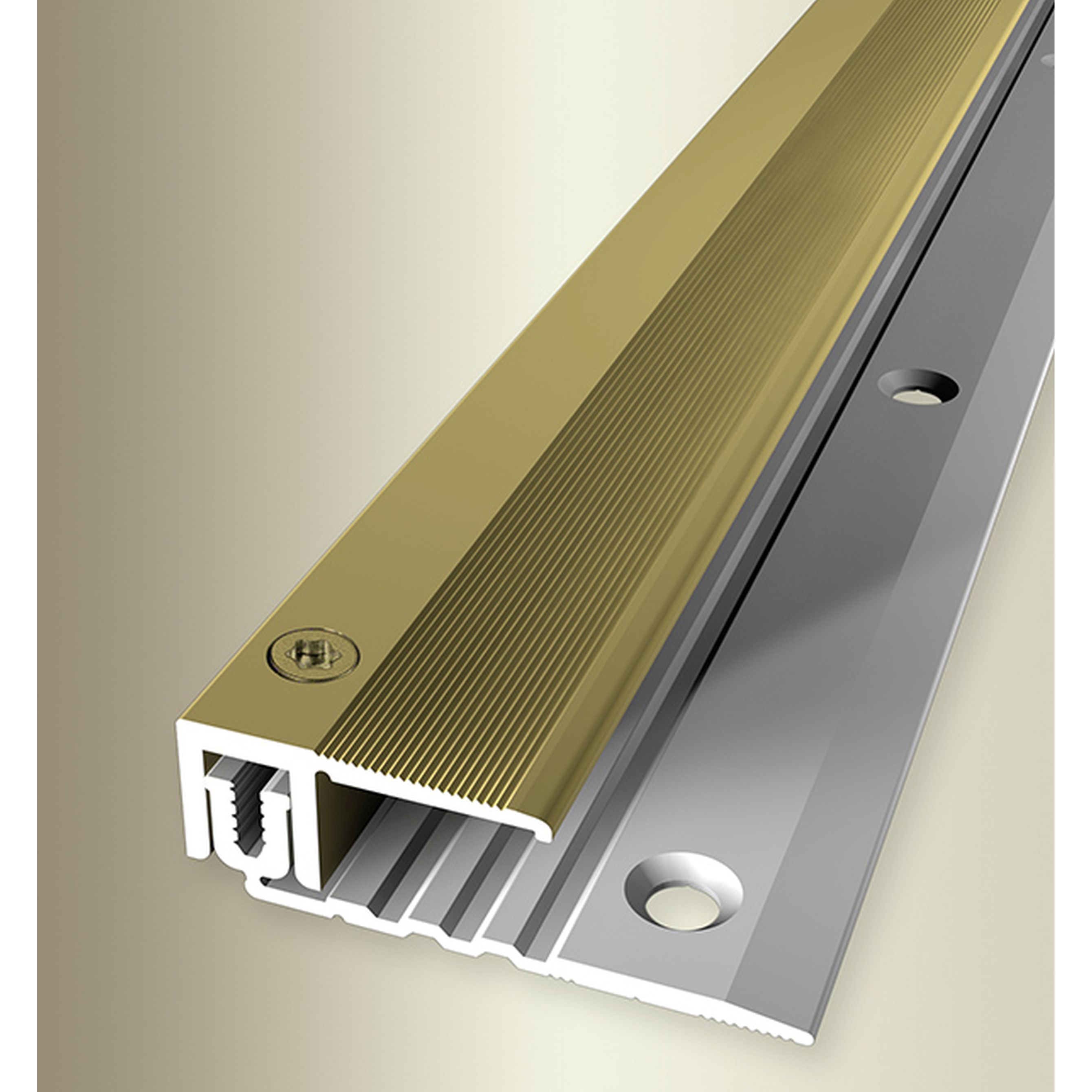 - COLORE: Oro. Grazie al suo aspetto semplice e moderno, questo colore si integra armoniosamente in qualsiasi stile di arredamento, indipendentemente dal fatto che i pavimenti siano scuri o chiari, o che le pareti siano bianche o colorate. DESIGN DEL PROFILO ACCATTIVANTE: Semplice, versatile e moderno. Questo profilo per pavimenti è senza tempo e un vero e proprio elemento di attrazione in ogni ambiente. APPLICAZIONE: I profili perimetrali proteggono idealmente i bordi del pavimento da eventuali danni e conferiscono alle finiture del pavimento un aspetto pulito e professionale. ACCESSORI: Le viti e i tasselli necessari sono inclusi. SUPERFICIE: Il profilo ha una superficie scanalata.