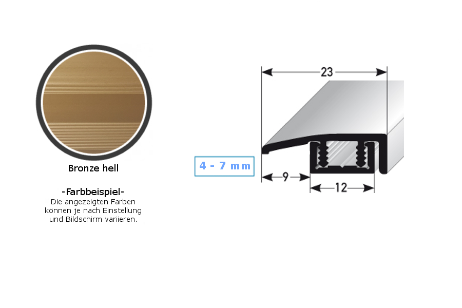 - COLORE: Bronzo chiaro. Grazie al suo aspetto semplice e moderno, questo colore si integra armoniosamente in qualsiasi stile di arredamento, indipendentemente dal fatto che i pavimenti siano scuri o chiari, o che le pareti siano bianche o colorate. DESIGN DEL PROFILO ACCATTIVANTE: Semplice, versatile e moderno. Questo profilo per pavimenti è senza tempo e un vero e proprio elemento di attrazione in ogni ambiente. APPLICAZIONE: I profili perimetrali proteggono idealmente i bordi del pavimento da eventuali danni e conferiscono alle finiture del pavimento un aspetto pulito e professionale. ACCESSORI: Le viti e i tasselli necessari sono inclusi. SUPERFICIE: Il profilo ha una superficie liscia.