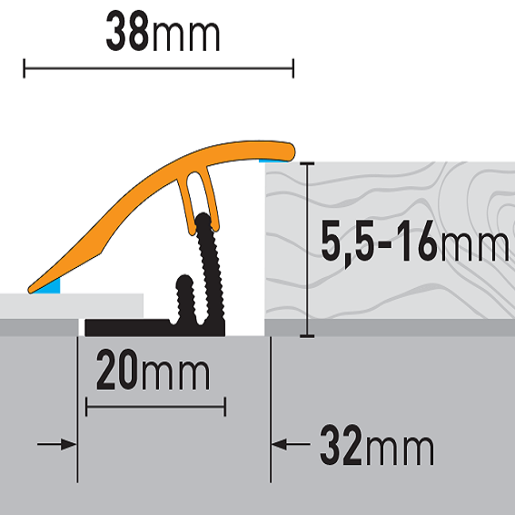 • DIMENSIONI: Il profilo di livellamento, che misura 10,23 x 38 x 930 mm, ha un'altezza di installazione compresa tra 5,5 e 16 mm.